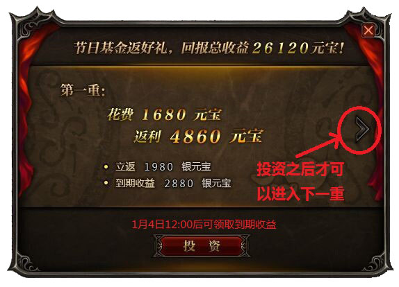 活动内容:在活动时间内,玩家可以在游戏界面右上角点击”节日理财“按钮进行投资,投资后立即获得部分返利,其余部分可在活动结束后任意时间进行领取,多倍的收益,绝对让你赚翻天!
